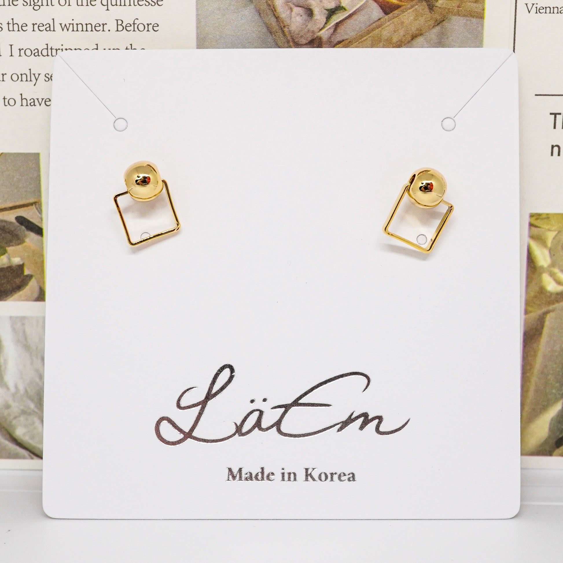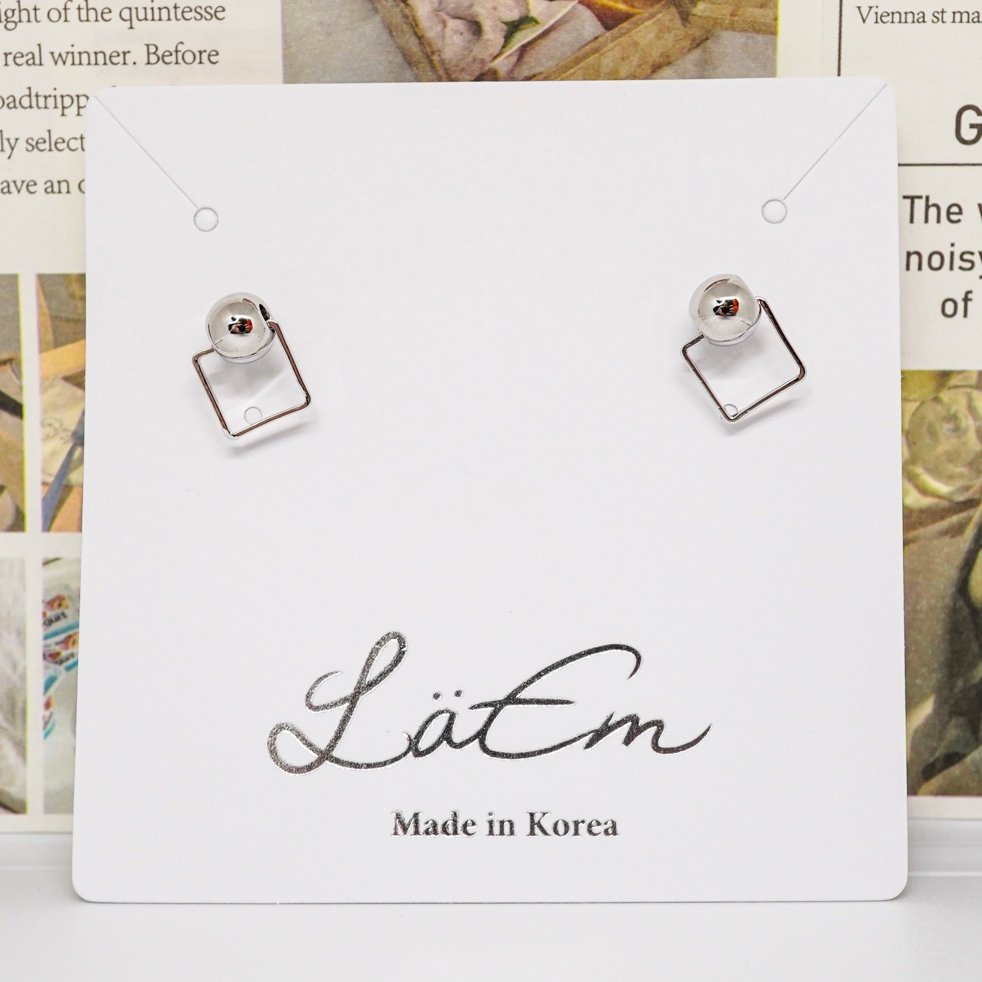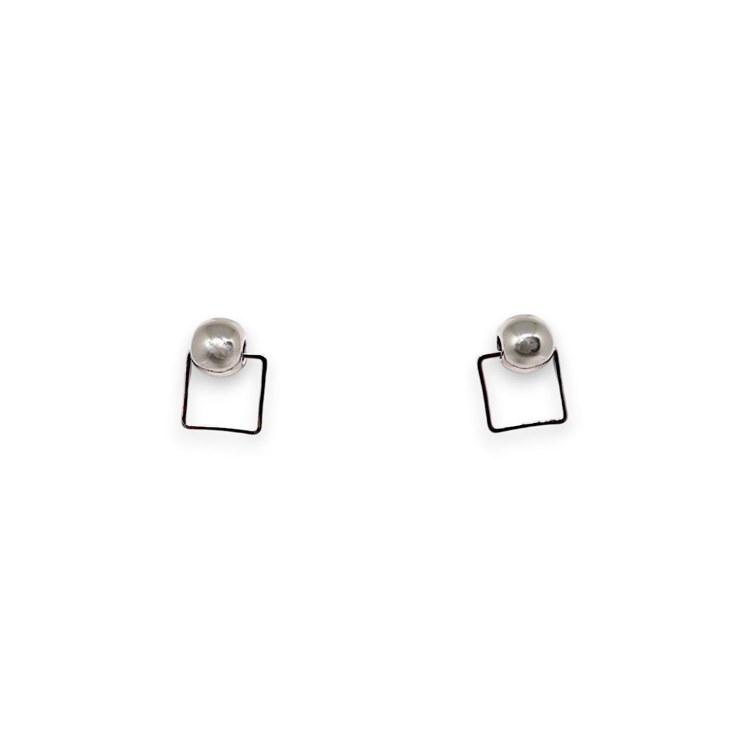Details: Feature a modern, minimalist design that combines geometric shapes with polished silver. Each earring is composed of a smooth, reflective silver or gold sphere positioned above a delicate square frame. The square frame features a clean, angular design that contrasts with the round sphere, creating a balanced yet striking look.