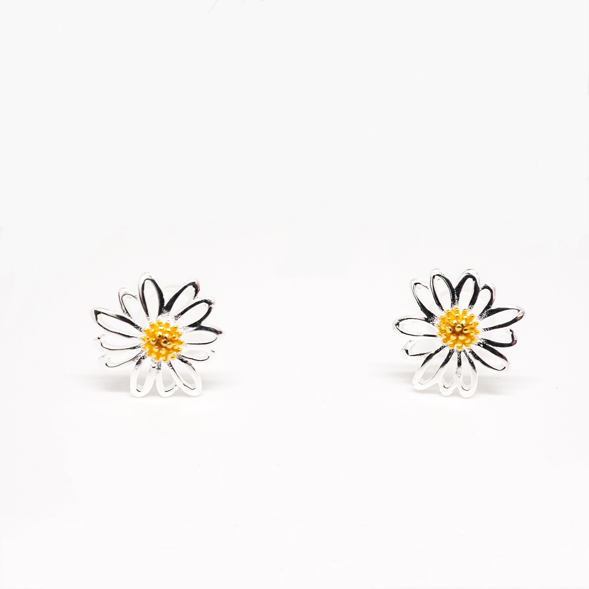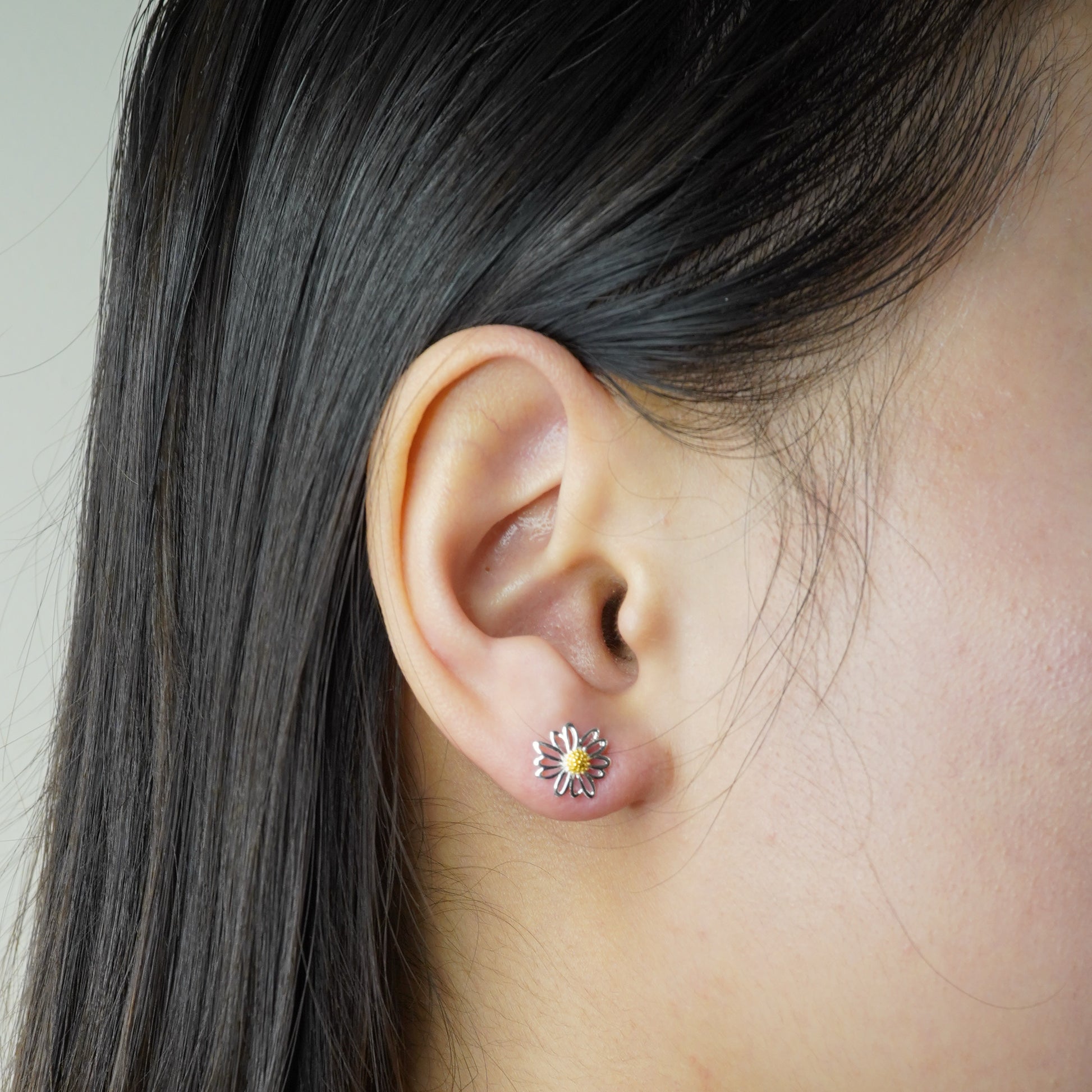 Details: Embrace the charm of nature with these little daisy studs, a delightful representation of blooming daisies. Crafted from high-quality sterling silver, the petals are intricately designed with a polished finish, creating a timeless, elegant look. The center of each flower features a vibrant yellow gold-toned texture, adding a warm contrast that mimics the natural beauty of daisy blossoms. Perfect for casual wear or special occasions, these earrings capture a fresh, youthful energy while maintaining a sophisticated edge.
