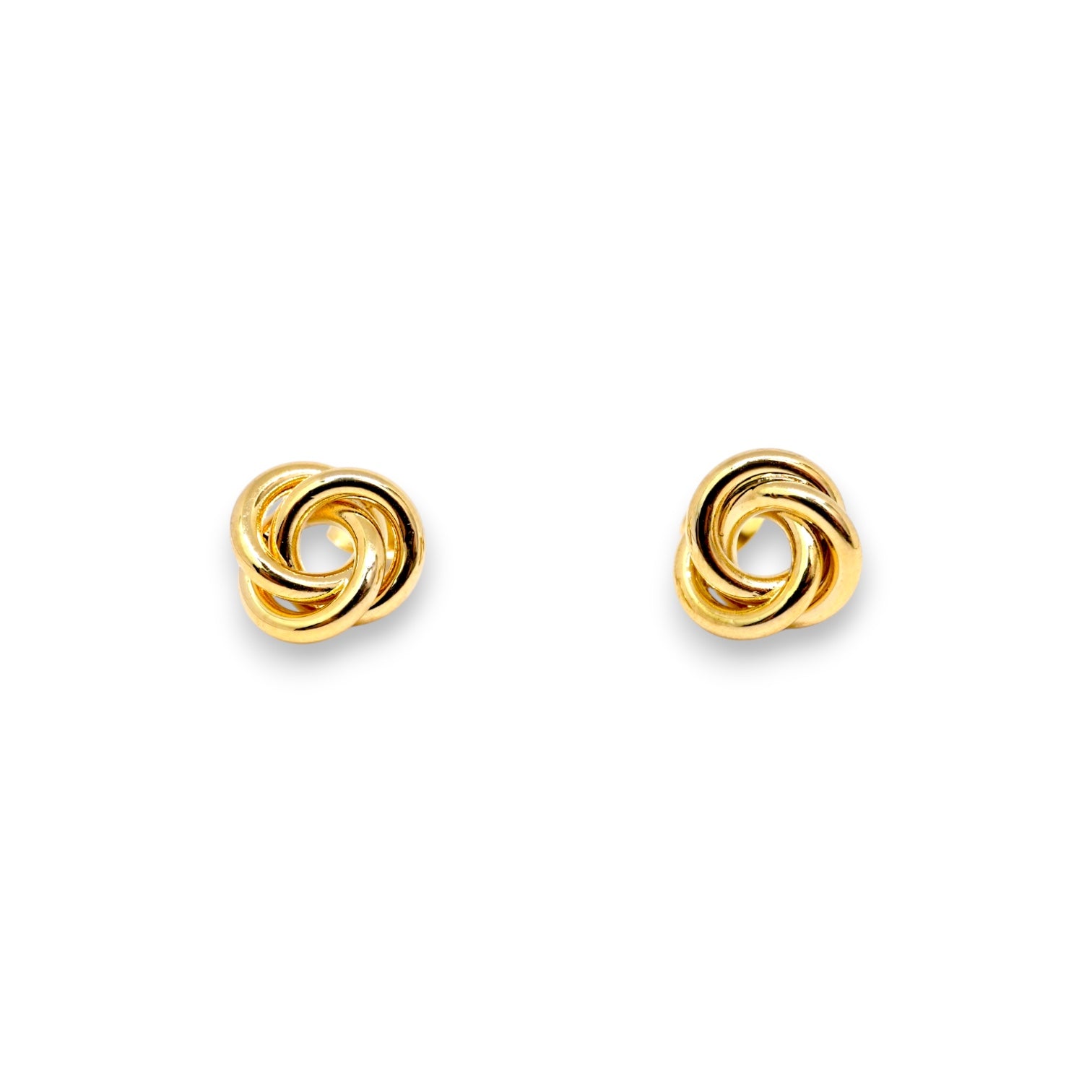 Details: Elegantly simple silver and gold stud earrings featuring an intricate knot design. The knot design features smooth, polished and gold-toned threads that interweave seamlessly to symbolize unity and timeless sophistication.